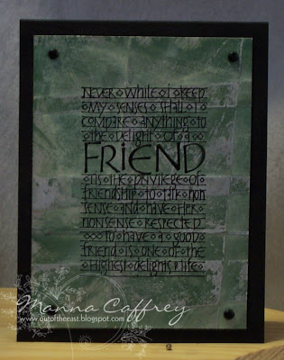 Faux weathered metal background is used for this card. Look at this post for how I did the background. The stamped image by Wordsworth was stamped with VersaMark and embossed with detailed black EP. Mounted onto a black card base with four black brads. A quickie for today. Gotta get our Christmas tree up. Family is coming next Saturday for our annual family Christmas get together. Have a great one and stay warm and dry!